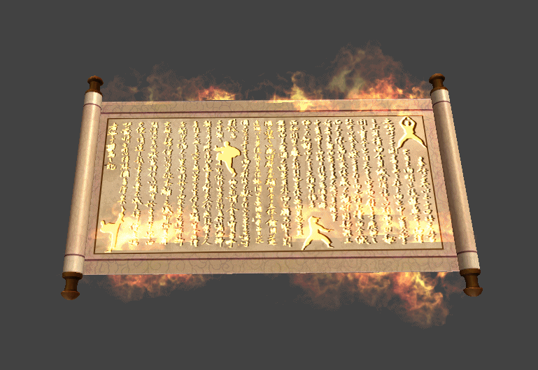 另一张图片就比较奇异了,是张动图,卷轴打开后有文字以及摆好各种招式练武的小人儿闪闪发光,感觉要跳出来的样子…额,这些招式很有点老电影《少林五行拳》的意思啊。而这应该就是这秘籍获取或者是学习时的过程。